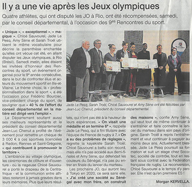 La matinée a également été l’occasion pour le Département de mettre en avant les 4 sportives bretilliennes qui ont participé aux Jeux Olympiques de Rio en août dernier (Jade Le Pesq, Sarah Troel, Chloë Savourel et Amy Sene) et de leur remettre un chèque de 3000 euros.