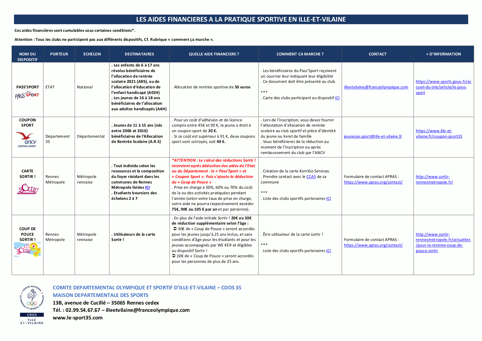 Pass'Sport, coupon sport, carte Sortir... comment vous y retrouver.... Le CDOS 35 vous propose un tableau récapitulatif des différentes aides en Ille-et-Vilaine.