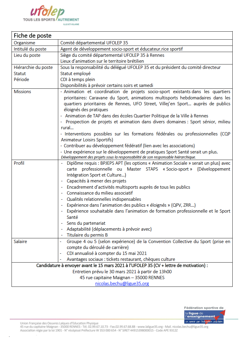 Offre d’emploi – Agent de développement socio-sport et éducateur.rice sportif CD 35 UFOLEP 1 mars 2021 Actus CDOS