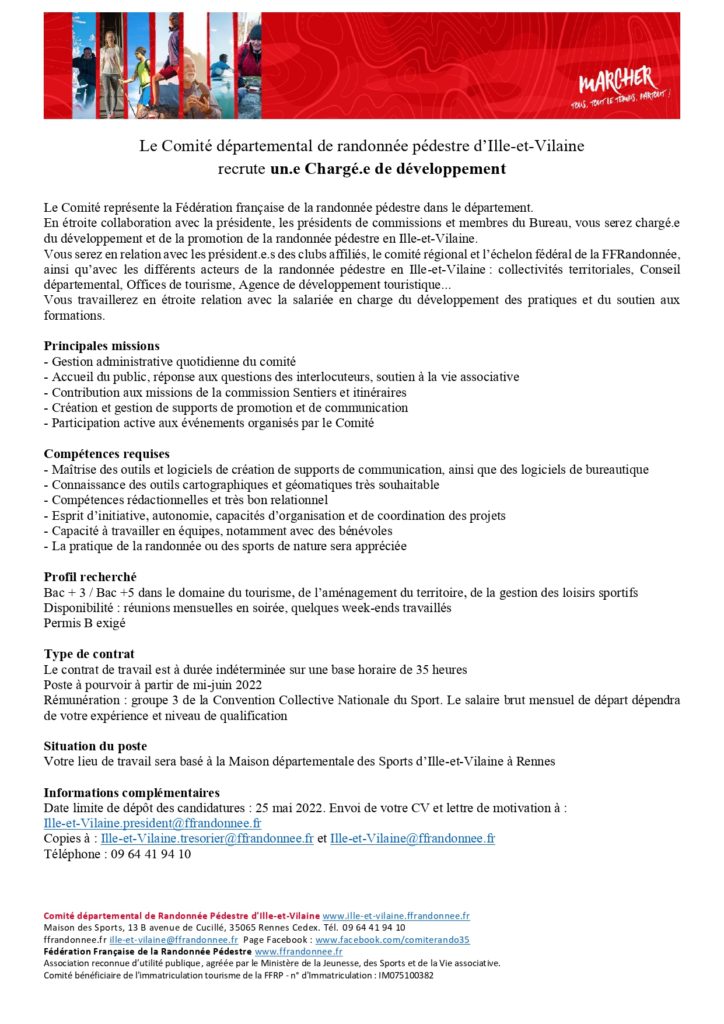 Le Comité départemental de randonnée pédestre d’Ille-et-Vilaine recrute un.e Chargé.e de développement.